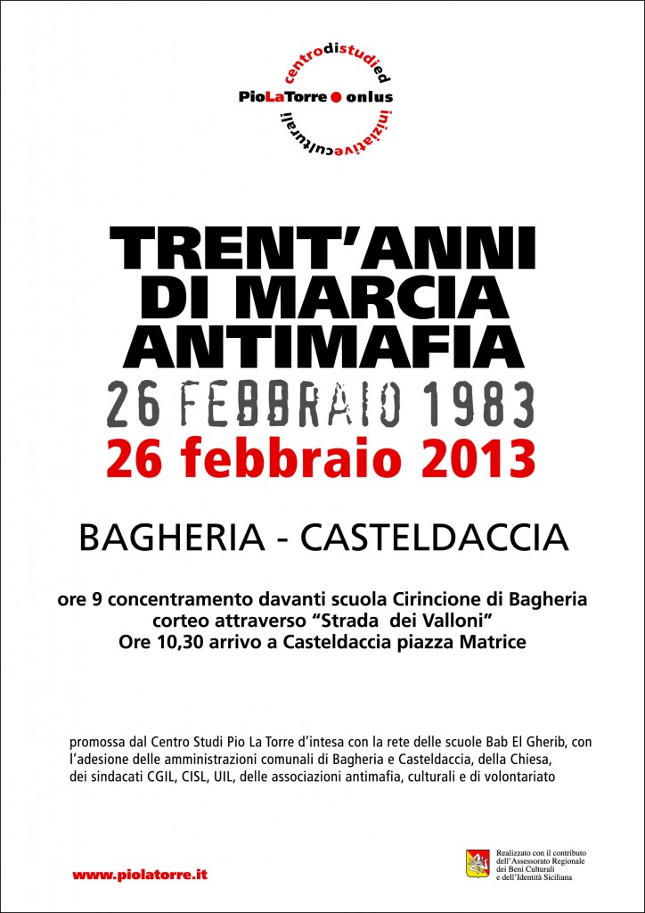 Per martedì 26 febbraio 2013, alle ore 9, su proposta del Centro Studi Pio La Torre, di intesa con la rete delle scuole “Bab el gherib”, e l’adesione della Chiesa, dei sindacati, del mondo dell’associazionismo e delle amministrazioni comunali, si terrà il concentramento degli studenti, docenti e cittadini nel piazzale davanti la scuola Cirincione di Bagheria, da dove, come trent’anni fa, il corteo si snoderà sino alla Piazza Matrice di Casteldaccia, attraverso la via dei Valloni, allora via di fuga dei killers e dei latitanti mafiosi.