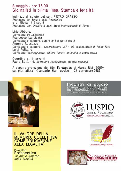 Il Presidente del Senato ospite di Stampa Romana per parlare di Informazione e legalità Blog Associazione stampa romana 3 Maggio 2013 Condividi Facebook Twitter Pinterest LinkedIn 0 0 http://www.stamparomana.it Lunedì 6 maggio alle ore 15, aula magna dell´Università degli studi Internazionali, via Cristoforo Colombo 200, Roma Scarica la locandina in pdf Da stamparomana.it Iscriviti alla Newsletter di Articolo21 Indirizzo Email* Nome Ho letto e accetto i termini e le condizioni