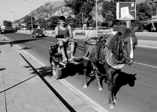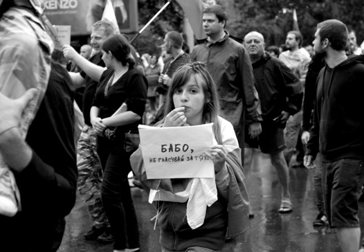 che porta patate in città col carretto di legno. Il pezzo sulle elezioni l’ho scritto il 23 giugno, la foto mostra i manifesti elettorali strappati dagli oppositori. Il pezzo sui rom l’ho scritto il 25,mostra un bambino rom all’interno del quartiere “ponte di buna”. Il pezzo sui treni l’ho scritto a cavallo tra il 26 ed il 28 giugno,la foto mostra il finestrino del treno bucato dai proiettili. Il pezzo sulla fabbrica in Grecia l’ho scritto il 30 giugno,la foto mostra uno striscione posto all’entrata della fabbrica,con su scritto un motto degli operai. Il pezzo sulla Turchia l’ho scritto il 3 luglio,la foto mostra un manifestante che crea un cordone per isolare la polizia. Il pezzo sul Kosovo l’ho scritto il 5 luglio, la foto mostra una bambina della struttura “pan di zucchero”. Il pezzo sulla Bulgaria l’ho scritto l’8 luglio, la foto mostra una bambina che manifesta e segue il corteo. L’ultimo pezzo su Belgrado-Srebrenica l’ho scritto il 12,la foto mostra un membro della donne in nero davanti il memoriale con su scritto i nomi delle vittime del genocidio.