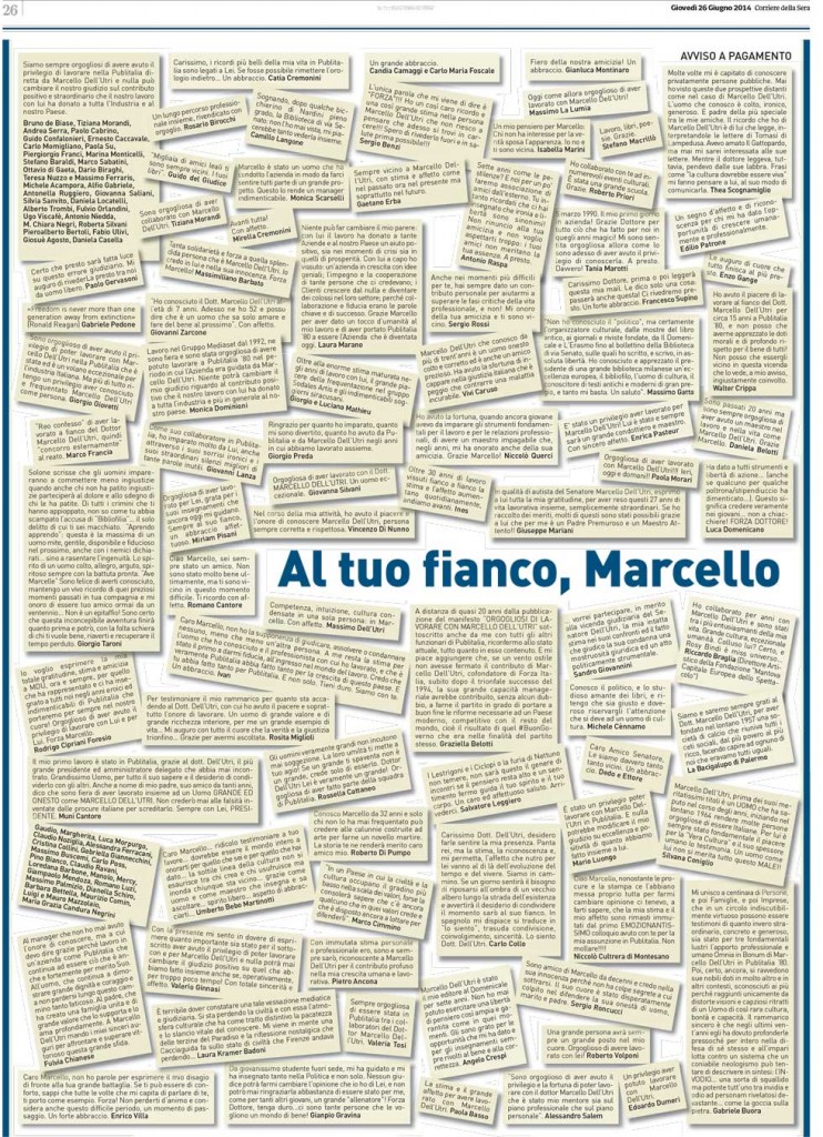 “E’ ”molto grave” accettare una pagina pubblicitaria acquistata dagli amici di Marcello Dell’Utri con messaggi di sostegno all’ex senatore condannato a sette anni di carcere per il reato di concorso esterno in associazione mafiosa”. Il Cdr del Corriere della Sera interviene dopo la pubblicazione sul quotidiano di un’intera pagina di messaggio pubblicitario dal titolo ‘Al tuo fianco Marcello’ e di una notizia in cronaca sull’iniziativa. L’organo di rappresentanza dei giornalisti del quotidiano di via Solferino ”ritiene molto grave la scelta compiuta dalla direzione di accettare passivamente un’intera pagina pubblicitaria acquistata dagli amici di Marcello Dell’Utri”, si legge in una nota del Comitato di redazione secondo il quale ”sarebbe stato piu’ opportuno rifiutare la pagina pubblicitaria” ed ”e’ comunque inaccettabile che la direzione del Corriere della Sera abbia deciso di pubblicare un testo simile senza sentire quantomeno il bisogno di prenderne le distanze”. A parere del Cdr ”inoltre e’ stato costituito un imbarazzante precedente. Da oggi, ci chiediamo, come il Corriere potra’ rifiutare analoghe richieste degli amici di altri condannati per mafia, seppur meno noti di Marcello Dell’Utri”.
