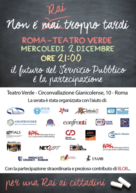 “Sono i cittadini i veri azionisti del servizio pubblico, e il soggetto centrale della sua missione. Per questo diciamo che la riforma della Rai è stata un’occasione persa, sia per la mancanza di un dibattito politico ampio, sia perché ha sostituito alla lottizzazione dei partiti il dirigismo del Governo. Ma la questione di un servizio pubblico abitato dal pluralismo delle idee e dalla rappresentazione di tutte le realtà sociali deve rimanere sul tavolo e coinvolgere tutti e tutte”. Così recita il comunicato che lancia l’iniziativa di domani, mercoledì 2 dicembre e che vedrà confrontarsi gli esponenti delle diverse associazioni promotrici di una serata sul presente e futuro della Rai.