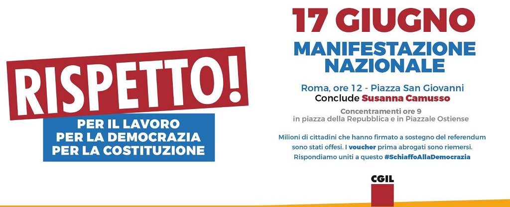 Invitiamo quindi le nostre associate e i nostri associati ad essere presenti alla manifestazione di sabato 17 giugno a Roma convocata dalla CGIL per il “Rispetto! Per il lavoro, per la Democrazia, per la Costituzione”: è una questione che riguarda i diritti civili e politici e il rispetto della volontà popolare, oltre alla lettera e allo spirito della nostra Carta, non la posizione sui voucer in quanto tali nè sugli altri aspetti tecnici della questione.Come associazione riteniamo che questa manifestazione non sia “contro” ma “a favore”, in questo caso a favore dei diritti di tutti i lavoratori e del dettato della Carta Costituzionale, ee è con questo spirito che aderiamo all’iniziativa.