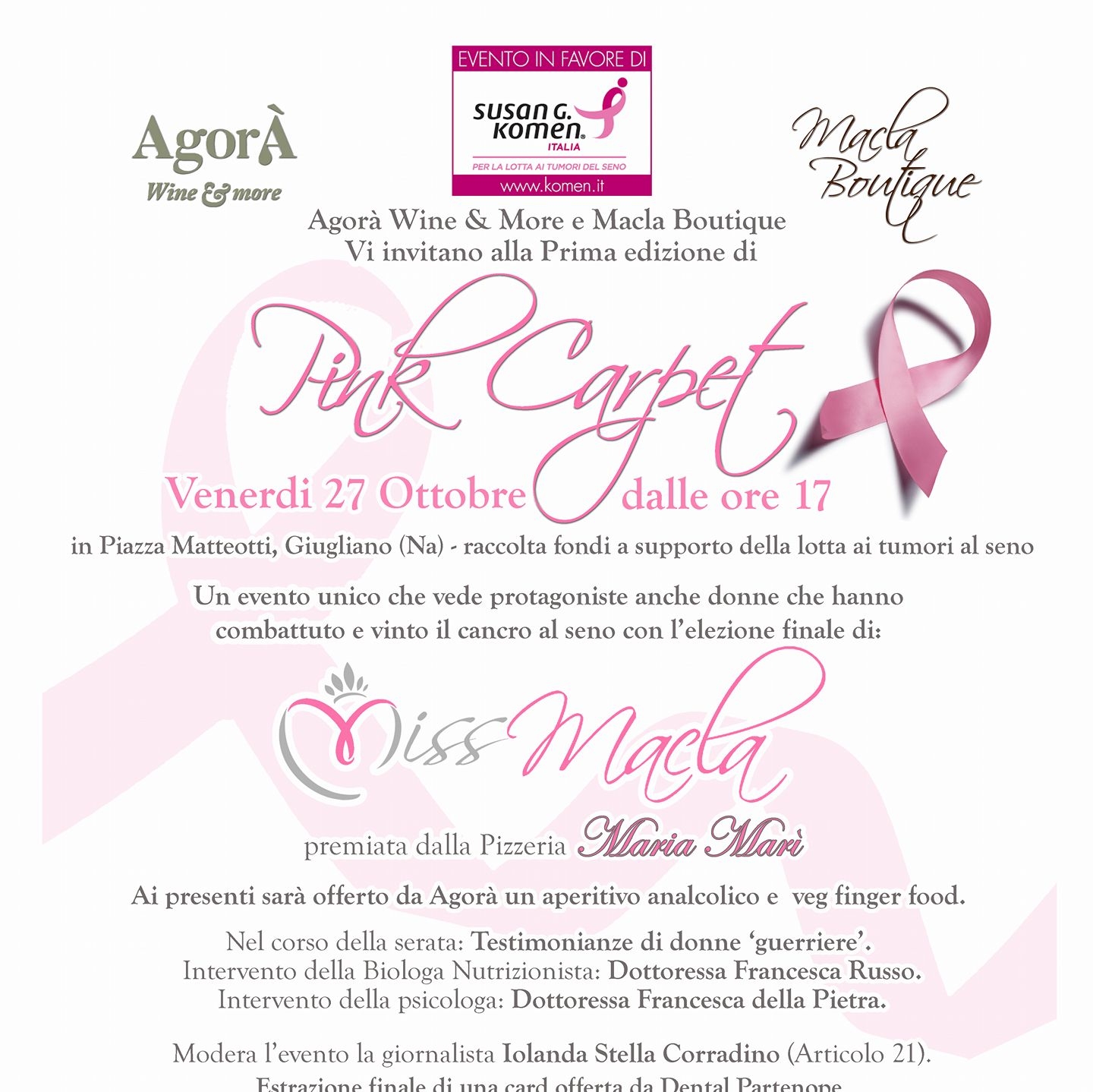 Per la prima volta in Campania e per la prima volta a Giugliano, arriva ‘Pink Carpet’, evento di raccolta fondi a supporto della lotta ai tumori del seno. L’iniziativa avrà luogo venerdì 27 ottobre a partire dalle 17 fino alle 20, in piazza Matteotti. Una kermesse senza precedenti, aperta a tutti, con la possibilità di informarsi ed informare e nel contempo contribuire alla ricerca gustando un apericena targato ‘Agorà wine & more’ partner dell’evento.