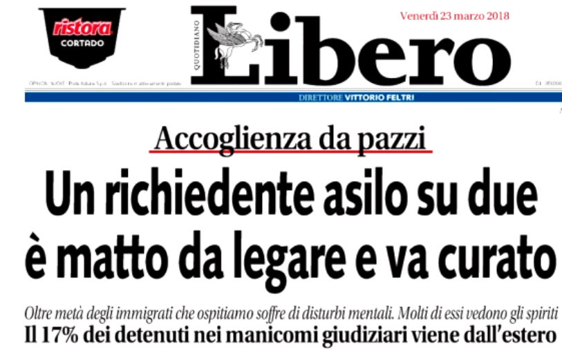 Pensavamo di aver visto il peggio nella recente campagna elettorale, ma ci siamo sbagliati. Oggi Libero torna alla carica con una delle sue migliori performance e lancia l’allarme sulla follia, annunciando che un immigrato su due è pazzo e, dunque (dedurrà il lettore), è pericoloso. A dire la verità è un tema ricorrente sulle pagine di quei quotidiani che non amano tanto offrire notizie e analisi dei fatti, quanto invece solleticare il nostro sistema nervoso per invitarci a prendere posizione contro “l’invasione”, o, più precisamente, contro “l’invasore”. È così che nascono titoli come: “Malaria extracomunitaria”, “Scabbia per 2 mila profughi”, “i disturbi mentali di chi arriva sul barcone”, “allarme sanità in Italia: frontiere aperte a ebola, lebbra e scabbia”. Ma oggi Libero sceglie di offrirci il peggio con un titolo di apertura che ci avvisa che “un richiedente asilo su due è matto da legare”.