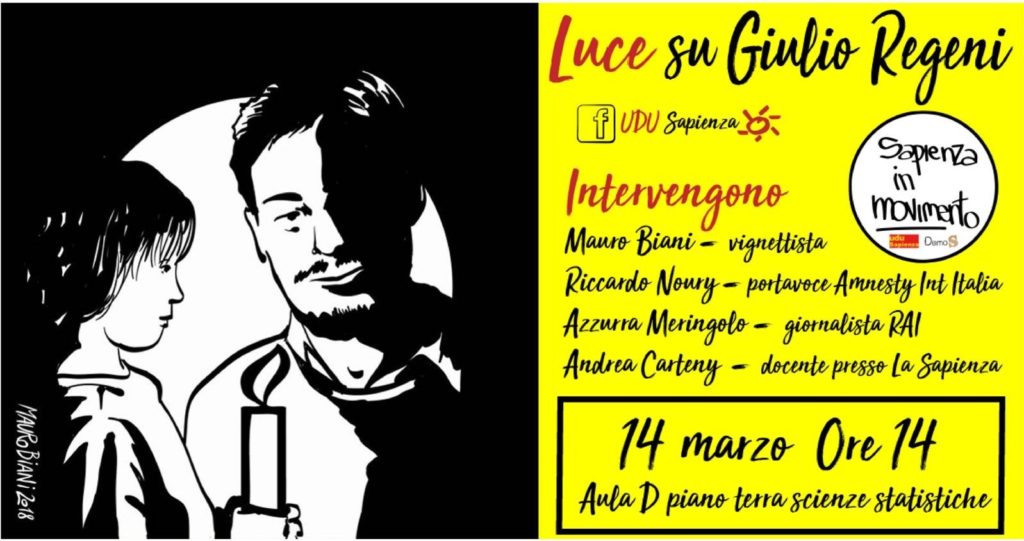 Questa iniziativa si inserisce nell’ambito della scorta mediatica per Giulio Regeni che, come promesso il 14 ottobre dello scorso anno alla Federazione nazionale della stampa italiana, Articolo 21, con la Fnsi e Amnesty Italia continuerà a portare avanti con l’obiettivo di tenere accesi i riflettori sull’uccisione del ricercatore italiano e chiedere di sapere i nomi di chi sequestrò, fece sparire, torturò e uccise Giulio Regeni al Cairo il 25 gennaio del 2016.