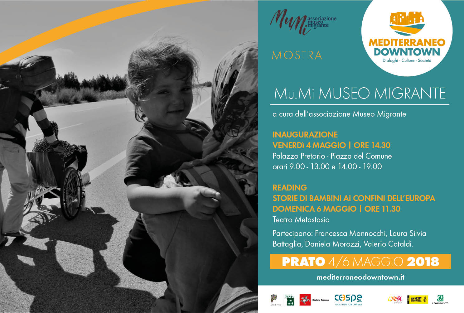 Ideata dall’Associazione Museo Migrante (Mu.Mi), arriva a Prato il dal 3 al 6 maggio a Palazzo Pretorio una mostra dedicata ai bambini migranti: “Storie di bambini ai confini dell’Europa”. Le tappe, o “stazioni”, che la mostra fa attraversare a partire dalla mappa del viaggio sono: le soglie, i confini, l’oppressione, lo spaesamento e l’orizzonte, per approdare infine a una nuova mappa costruita insieme da tutti coloro che incontrano le storie dei bambini, come per indicare la costruzione di una nuova comunità possibile.