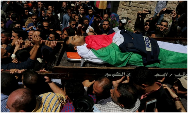 Yasser Murtaja, un fotografo di 31 anni, indossava un giubbotto con scritto della chiaramente “Stampa“ mentre faceva un servizio sulla manifestazione di massa lungo il confine con Gaza, a Khuzaa, il 6 aprile, giorno in cui è stato ucciso. La zona è stata avviluppata da un denso fumo nero provocato dagli pneumatici che erano stati incendiati. Murtaja è stato uno dei circa 30 palestinesi uccisi dal fuoco israeliano negli scorsi 10 giorni lungo il confine. 491 persone erano state ferite durante la protesta di venerdì scorso (6 aprile) contro la fondazione dello stato di Israele nel 1948. E’ in programma la continuazione delle dimostrazioni di massa fino al 15 maggio.