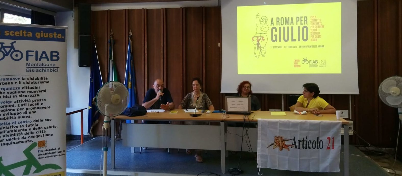 Perché questa tragedia non ha segnato irrimediabilmente solo la vita della famiglia Regeni, ma ha toccato quella di tanti che non si rassegnano a non sapere, che non accettano l’ingiustizia, che vogliono indagare le ragioni. Come dovrebbe fare ogni buon giornalista: Giulio non lo era, ma il suo stile era molto vicino a quello di chi consuma le scarpe per andare, vedere, raccontare. È per questo, ha detto Cristiano Degano, presidente dell’Ordine dei Giornalisti del Friuli Venezia Giulia, che siamo da sempre in prima linea in questa battaglia; è per questo, gli ha fatto eco Alessandro Martegani, segretario del’’Assostampa Fvg, che in piena sintonia con la Federazione Nazionale della Stampa Italiana e con il suo presidente Beppe Giulietti, il tema dei diritti umani è tornato sulle prime pagine della nostra agenda; è per questo che anche l’Unione Cattolica Stampa Italiana, da sempre attenta alla qualità dell’informazione al di là delle tessere professionali e da poco nuovamente presente in Friuli Venezia Giulia e rappresentata dalla sua presidente Luisa Pozzar, ha voluto patrocinare l’iniziativa. È per questo che noi di Articolo 21 continueremo a fare la scorta mediatica a Giulio e a tutti i Giulio e le Giulia del mondo, felici di poter contare anche su un bel po’ di ruote e di pedali, che renderanno l’impresa meno ardua e più condivisa. Perché la bici fa girare meglio le notizie e non lascia indietro nessuno.