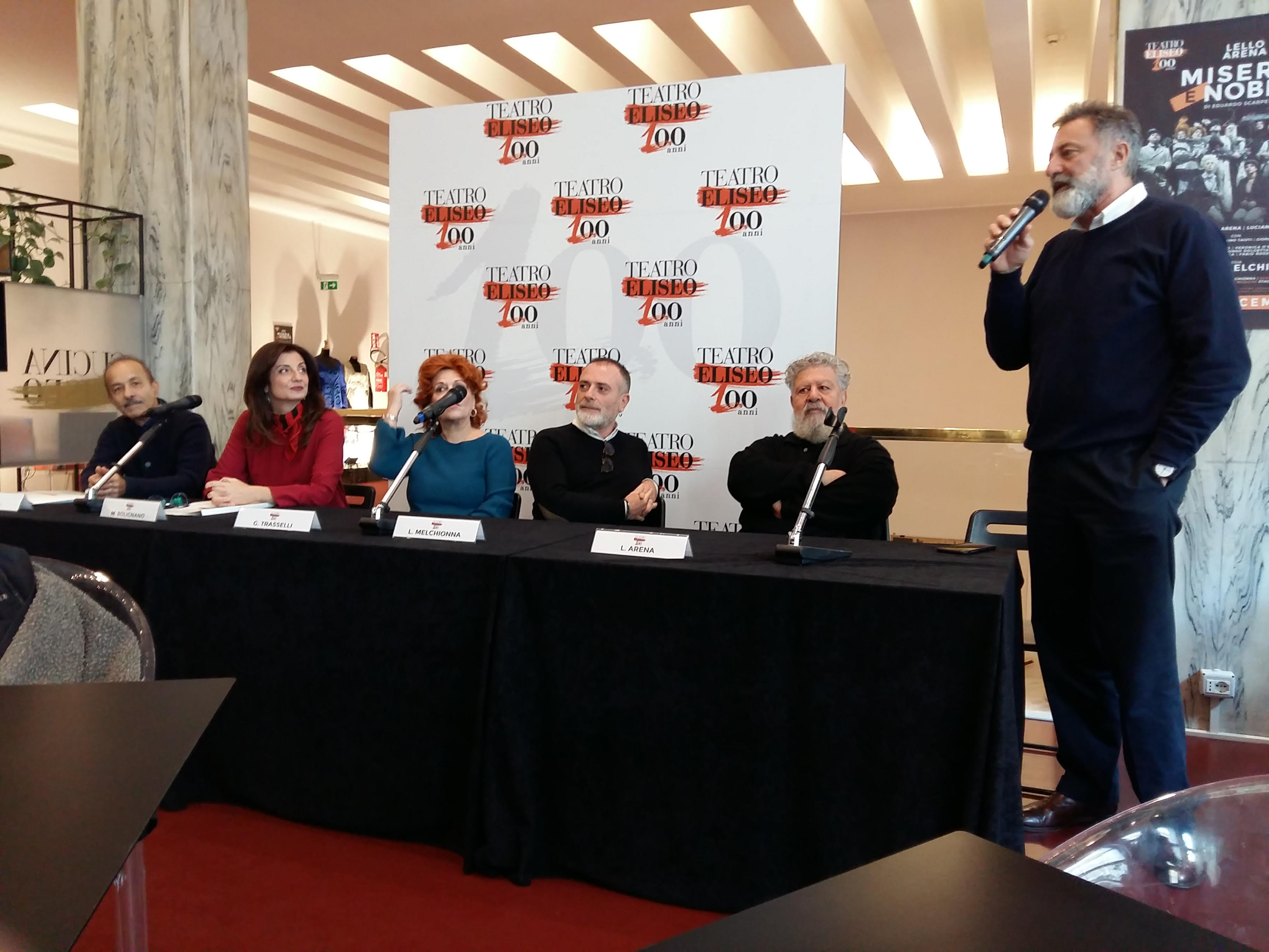 Tutti i presenti della compagnia di “Miseria e nobiltà” che va in scena al Teatro Eliseo dal 27 dicembre al 20 gennaio 2019 ringraziano Luca Barbareschi, valido direttore del teatro della capitale, per l’opportunità offerta. Barbareschi all’inizio della conferenza stampa ha portato ad attori e regista il suo saluto e augurio. Scelta oculata quella di Luca Barbareschi: “Miseria e nobiltà” è un grande classico di Eduardo Scarpetta con adattamento di Lello Arena e Luciano Melchionna. Non è un caso che la decisione di riproporre quest’opera tragicomica – alla quale non sfugge l’associazione con il film di Mauro Mattoli del 1954, interpretato da Totò e Sofia Loren – sia maturata in un periodo in cui di miseria si torna a parlare, anche se il regista Luciano Melchionna specifica di aver ritenuto “inutile forzare la mano al testo, pur se dell’attualità giungono echi”. Uno spettacolo che rispetta il lavoro originale – ha spiegato Melchionna in conferenza stampa – recuperandone l’universalità del messaggio. Uno spettacolo nel quale il pubblico di oggi si é identificato se – come ha raccontato Lello Arena – giunge all’Eliseo gravido di successi.