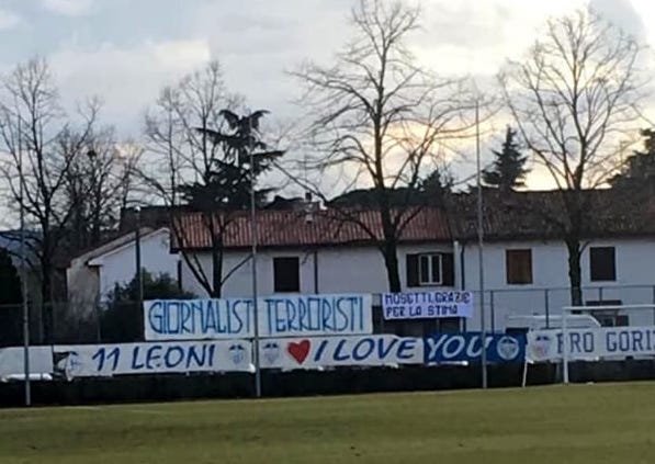 Il mondo dei ” social” ha dato una particolare connotazione di violenza ad alcune forme di “conversazione” ed è a questo tipo di improbabile “discussione” che va ricondotto anche lo striscione apparso domenica allo stadio Bearzot di Gorizia. “Giornalisti terroristi” non può essere altro che la sintesi di un pensiero ammalato secondo il quale le responsabilità – e le conseguenze – di un episodio stupido, incivile e anacronistico ( i cori nazisti e gli insulti all’arbitro della settimana prima a Cordenons) non sono ascrivibili a quel gruppetto di ultras che di quel gesto si erano resi protagonisti, me debbono essere ricercate in chi ha rappresentato sulla carta stampata quella situazione di degrado morale che da tempo attraversa anche il mondo che fa da contorno allo sport.