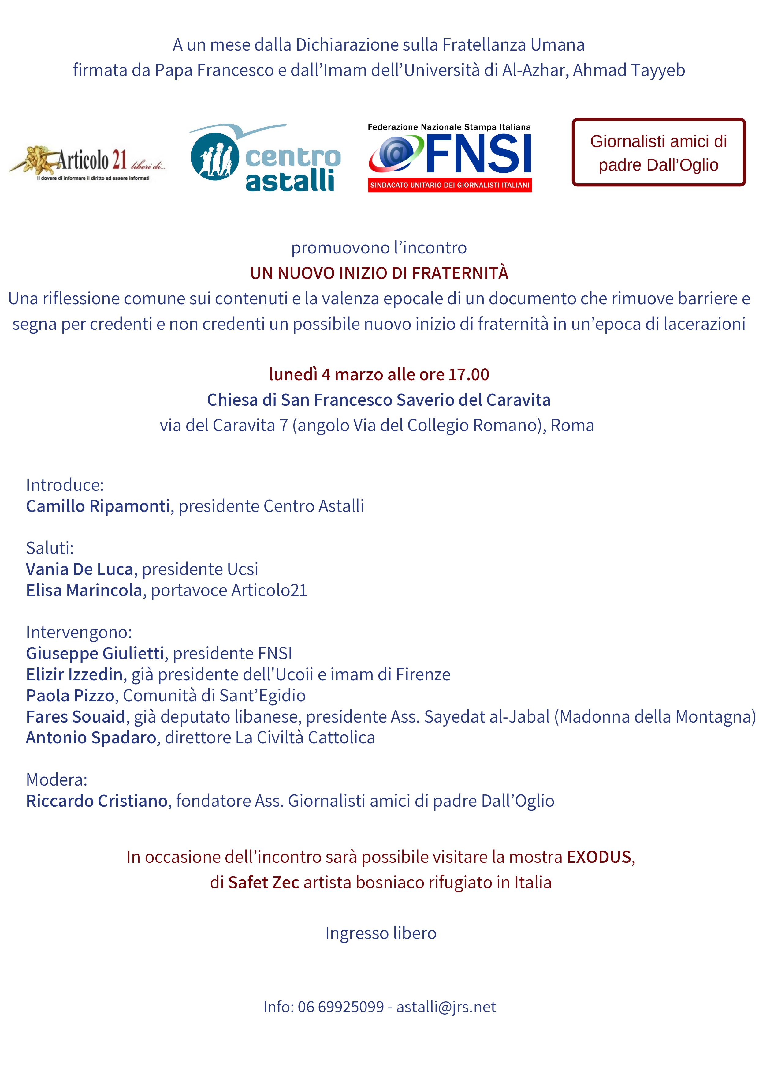 L’eccezionalità di questo evento che segna davvero un nuovo inizio, sarà oggetto di un’approfondita discussione, la prima da quel 4 febbraio, esattamente a un mese di distanza, lunedì 4 marzo alle ore 17.00. Promosso da Articolo21, dall’Associazione giornalisti amici di padre Dall’Oglio, dal Centro Astalli e dalla Federazione Nazionale della Stampa Italiana, l’incontro avrà luogo presso la Chiesa di San Francesco del Caravita, in Via del Caravita 7 (angolo Via del Collegio Romano), che ospita in queste settimane le opere pittoriche di Safet Zec, rifugiato bosniaco in Italia. La sua esposizione si chiama “EXODUS” e offre una rappresentazione del dramma dei richiedenti asilo, che chiedono, appunto, fratellanza.
