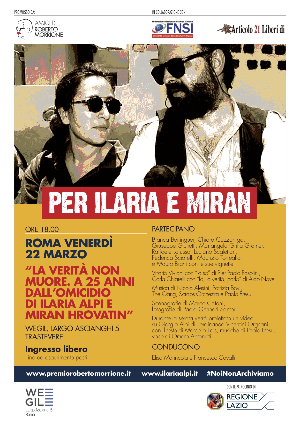 Le giornate dedicate a Ilaria Alpi e Miran Hrovatin si concluderanno venerdì 22 marzo con la serata per Ilaria e Miran “La verità non muore a 25 anni dall’omicidio di Ilaria e Miran” al WeGil, Largo Aschianghi 5 a Trastevere, Roma, dalle ore 18 condotta da Elisa Marincola e Francesco Cavalli e promossa dall’associazione Amici di Roberto Morrione in collaborazione con Articolo 21 e FNSI e il patrocinio della Regione Lazio. Musica, parole e immagini verranno ripercorsi questi 25 anni e ricordati Luciana e Giorgio Alpi. Interverranno fra gli altri Raffaele Lorusso, segretario Federazione Nazionale della Stampa Italiana, Mariangela Gritta Grainer, Federica Sciarelli, Maurizio Torrealta, Luciano Scalettari, Chiara Cazzaniga, Bianca Berlinguer e Giuseppe Giulietti. L’attore Vittorio Viviani interpreterà “Io so” di Pasolini, mentre il testo di Aldo Nove “Io, la verità, parlo” è affidato all’attrice Carla Chiarelli. Il contributo musicale sarà dei musicisti Nicola Alesini e Patrizia Bovi, di Paolo Fresu, del gruppo folk rock The Gang e della Scraps Orchestra. Durante la serata verrà proiettato un video su Giorgio Alpi di Ferdinando Vicentini Orgnani, con il testo di Marcello Fois, musiche di Paolo Fresu, voce di Omero Antonutti. L’ingresso è libero.