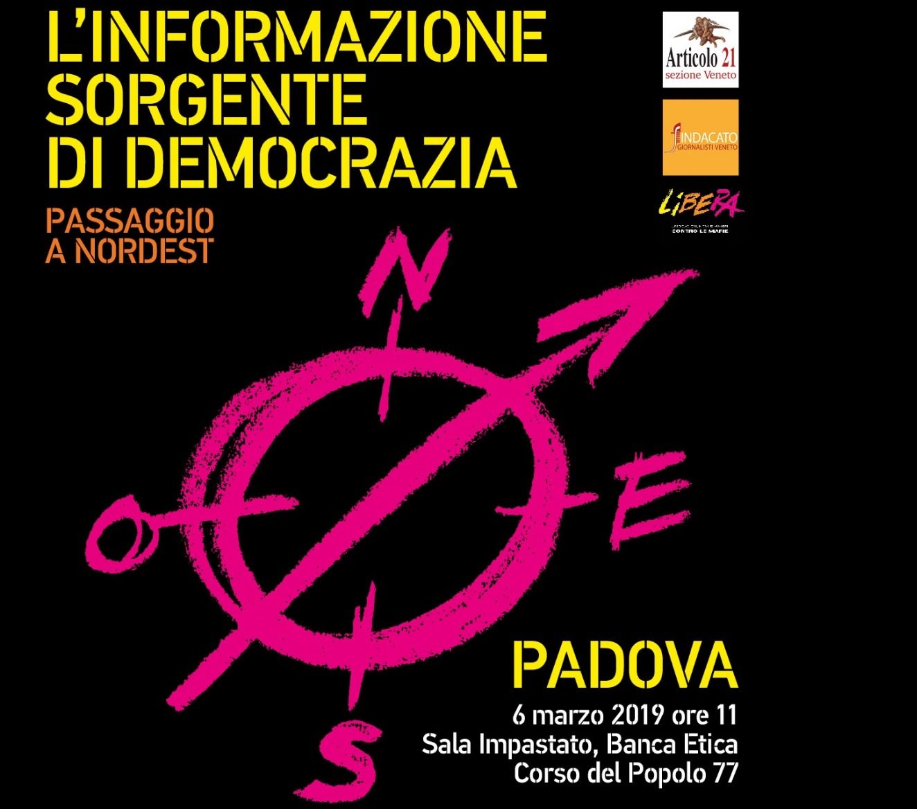 Il lavoro giornalistico come strumento per illuminare le zone d’ombra, dove spesso si annidano criminalità organizzata e malaffare. Questo il tema dell’incontro “L’informazione sorgente di democrazia” mercoledì 6 marzo alle 11 a Padova nella sala Impastato di Banca Etica in corso del Popolo 77. Interverranno don Luigi Ciotti. Interverranno don Luigi Ciotti (fondatore di Libera), Giuseppe Giulietti (presidente Fnsi), Monica Andolfatto (segretaria Sindacato giornalisti del Veneto), quest’ultima cronista del Gazzettino minacciata dalla camorra insediatasi nel Veneto Orientale, dove la Dda ha disposto 50 misure di custodia cautelare, di cui una rivolta al sindaco di Eraclea. L’appuntamento è parte del percorso che il 21 marzo condurrà, sempre a Padova, alla manifestazione nazionale per la Giornata della memoria delle vittime delle mafie. Organizzano Fnsi, Sindacato giornalisti del Veneto, Libera, Articolo 21.