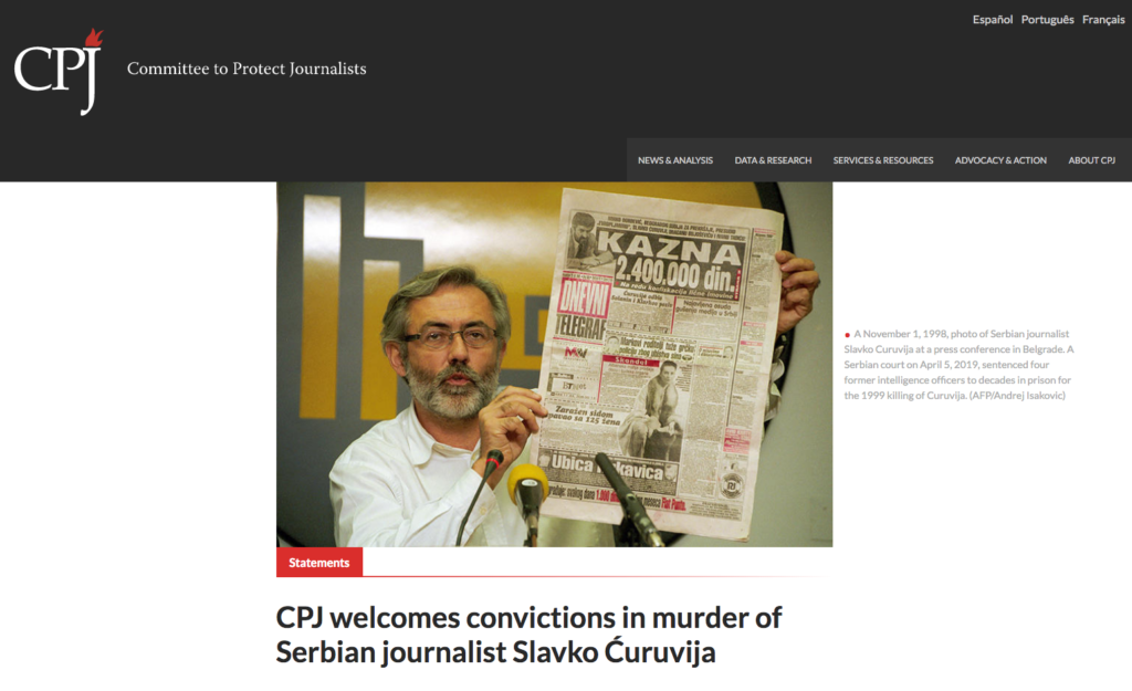 Quattro anni dopo l’inizio del processo per l’omicidio del giornalista ed editore Slavko Ćuruvija e vent’anni dopo il delitto, avvenuto davanti all’abitazione di Ćuruvija, la Sezione speciale per i reati di criminalità organizzata dell’Alta corte di Belgrado ha condannato quattro imputati, ex membri dei servizi segreti serbi, ad un totale di 100 anni di reclusione. Si tratta della prima sentenza di condanna per omicidio di un giornalista emessa a carico di ex agenti dei servizi segreti. Con questa sentenza la corte ha confermato che l’omicidio di Ćuruvija fu un delitto di stato. Dagli anni Novanta ad oggi in Serbia sono stati brutalmente uccisi altri due giornalisti Dada Vujasinović e Milan Pantić. Questi omicidi rimangono a tutt’oggi irrisolti.