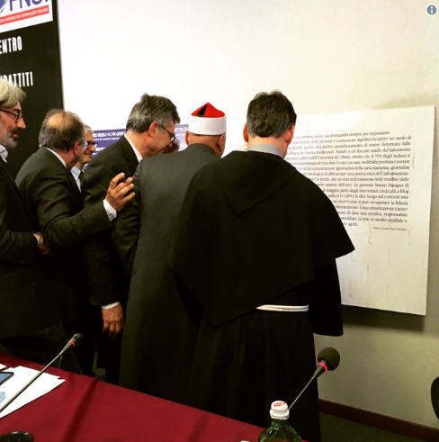 Nel pomeriggio è stata presentata la Carta di Assisi, il primo manifesto internazionale contro i muri mediatici. Al momento della firma, presso la sede della Fnsi a Roma, hanno partecipato l’Imam della Grande Moschea di Roma, Saleh Ramadan Elsayed, la presidente della Comunità Ebraica di Roma, Ruth Dureghello, e il Custode del Sacro Convento di Assisi, padre Mauro Gambetti. Alla presentazione, moderata da Roberto Natale, coordinatore del Comitato scientifico di Articolo 21, sono intervenuti tra gli altri il prefetto del Dicastero per la comunicazione della Santa Sede, Paolo Ruffini, il direttore di Civiltà Cattolica, padre Antonio Spadaro, il direttore della Sala Stampa della Basilica di San Francesco d’Assisi, Padre Enzo Fortunato, il responsabile comunicazione della Federazione delle chiese evangeliche in Italia, Gian Mario Gillio, il presidente della Fnsi, Giuseppe Giulietti, il segretario generale della Società San Paolo, Don Stefano Stimamiglio, e il direttore di Articolo 21, Paolo Borrometi.