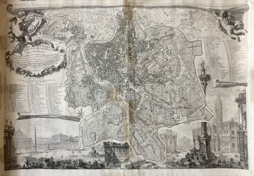 “Meno antica”, rispetto alla precedenti ma di grande bellezza è poi la mappa di Giovan Battista Piranesi, una acquaforte con la pianta topografica della città eterna del 1748.