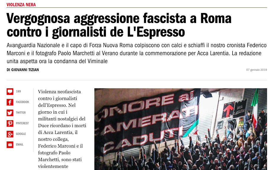 Federico Marconi, cronista de l’Espresso, e il fotoreporter Paolo Marchetti erano lì per documentare, per l’inchiesta che da tempo il settimanale svolge sui gruppi dell’estrema destra. Vengono notati, circondati, malmenati, viene sottratta la scheda della fotocamera di Marchetti. A Federico, preso a calci e schiaffi, viene intimato di cancellare le foto dal telefono che poi gli viene tolto di mano per controllare se l’ha fatto davvero. Allora partono minacce e insulti e poi il manipolo si allontana.