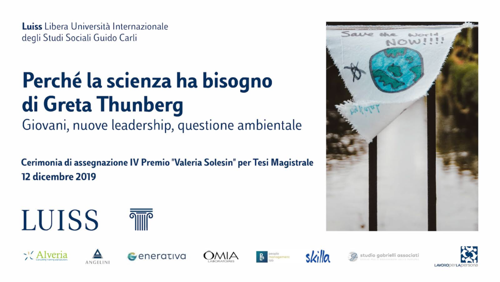 Ricordare chi ha dedicato la vita allo studio e alla ricerca, sostenendo giovani laureati: è con questo spirito che la Fondazione Lavoroperlapersona ha istituito il “Premio Valeria Solesin” per tesi magistrali. Un’iniziativa, giunta alla quarta edizione, che unisce il desiderio di reagire di fronte all’orrore oscurantista con il coraggio delle idee. La cerimonia per l’assegnazione del Premio si svolgerà giovedì 12 dicembre 2019, a partire dalle 18:00, all’interno dell’Aula Toti dell’Università Luiss Guido Carli, in Viale Romania 32 a Roma.