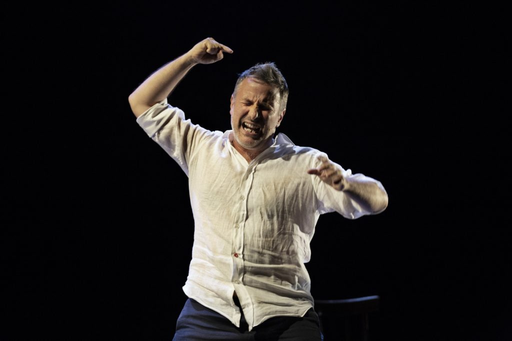Come nella tragedia oltre agli umani Mortali, Enia mette in scena anche gli Eroi, il palombaro, i pescatori, gli uomini rana del salvataggio tra le onde, il medico che si muove pietoso delle carni in putrefazione o il becchino che mette croci sulle tombe di sconosciuti, forse musulmani, per dare dignità, a suo modo, a tutti, nel cimitero di Lampedusa. Tutti figure che vediamo muoversi vive sul palcoscenico, tale la forza del racconto. E questo, in un’epoca dove senza elettricità sembra non sia possibile più fare teatro è una bella medaglia. Il quadro mitologico è completo e sovrastato dal Dio Mare e dall’Abisso, un altro dio terribile. Entrambi innocenti, come tutte le cose della natura, come bestie a cui sembra non sia possibile fare nulla. E qui forse la sicilianità dell’attore, la grecità per studio artistico, o entrambe portano ad evitare l’utilizzo della parola speranza – la “spes” cristiana – su questo infinito di ripetersi di morti, sulla follia degli accadimenti che attraversa tutti. Non parla ed usa il gesto e lo sguardo (la miglior parola è quella che non si pronuncia) su questa follia di accadimenti, su questo umano disastro che cade su altri umani, sulle nostre spalle. Così stanno le cose e basta. Tutto questo compone la metà del suo spettacolo.