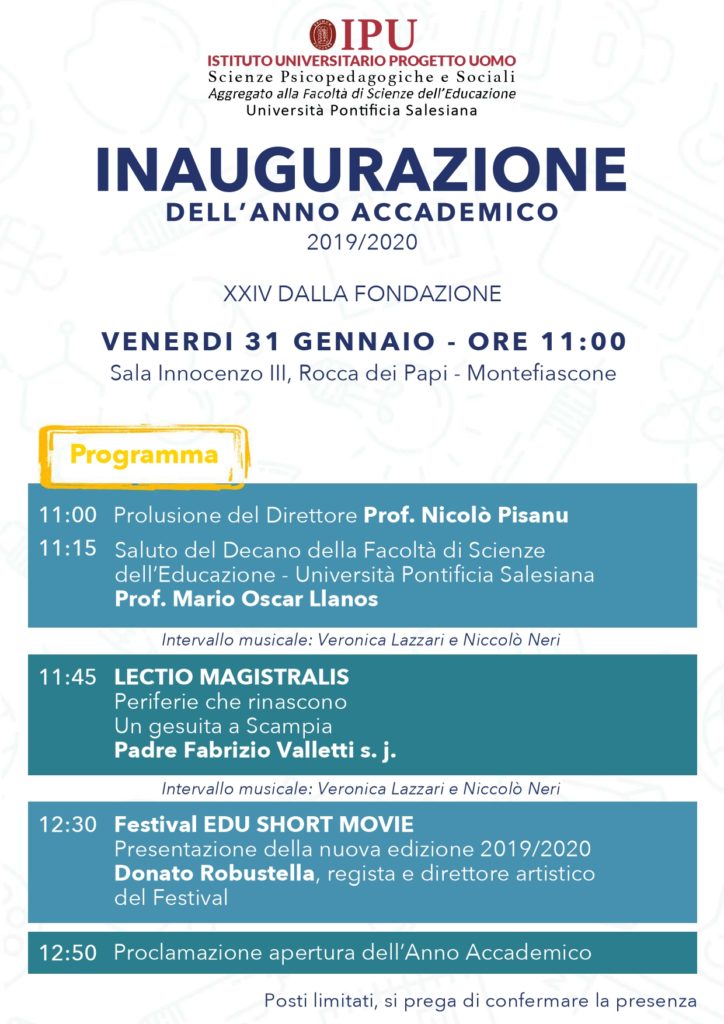 Dopo la prolusione del preside Nicolò Pisanu, il programma prevede il saluto del Decano della Facoltà di Scienze dell’Educazione dell’Università Salesiana, Prof. Mario Oscar Llanos, e la lezione di Padre Valletti “Periferie che rinascono. Un gesuita a Scampia”.