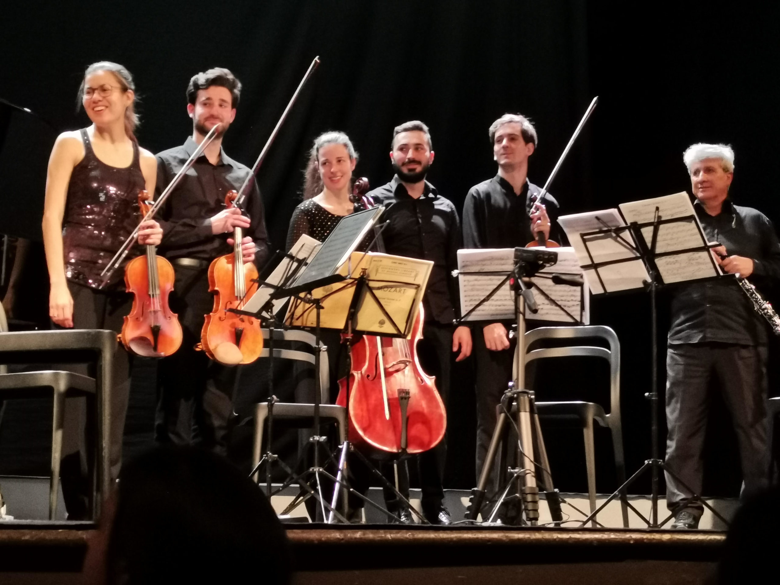 Il programma comprendeva nella prima parte il Quartetto per pianoforte in Sol min. n° 1, K 478 con pianoforte, violino, viola e violoncello; nella seconda il Quintetto in La maggiore per clarinetto, K 581 con clarinetto, due violini, viola e violoncello. Quartetto e quintetto sono l’uno del 1785, l’altro del 1789, periodo chiaramente influenzato dai moti che han dato vita alla rivoluzione francese. Nella splendida fluidità musicale, che i musicisti hanno espresso, anche visivamente col ritmo che ha percorso i corpi, sembrano alternarsi echi contrastanti e drammatici a quelli più disimpegnati, teneri passi cantabili ad altri soffusi di malinconico dolore. Alla fine i battimani sono stati una scrosciante cascata, placata solo con il bis.