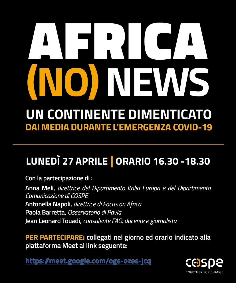 Ne parleremo lunedì 27 aprile a un webinair sulla piattaforma Meet (qui e in fondo il link per partecipare) promosso da COSPE con il supporto di Focus on Africa dal titolo “Africa (no) news” (16.30 -18.30).