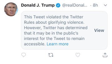 La risposta di Twitter a questo secondo post è stata infatti quella di nasconderlo, senza cancellarlo, e di poterlo leggere in quanto di possibile pubblico interesse, con il seguente commento: “Questo tweet viola le regole di Twitter sull’esaltazione della violenza. Ma Twitter ha stabilito che è nell’interesse pubblico che resti accessibile”.
