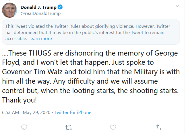 Questo tweet è rimasto visibile, ma non il suo proseguimento che dice: “… questi TEPPISTI stanno disonorando il ricordo di George Floyd, e io non permetterò che accada. Ho appena parlato con il governatore Tim Walz e gli ho detto che le forze armate sono totalmente con lui. Se ci sono difficoltà, assumeremo il controllo, ma quando parte il saccheggio, si inizia a sparare. Grazie!”.