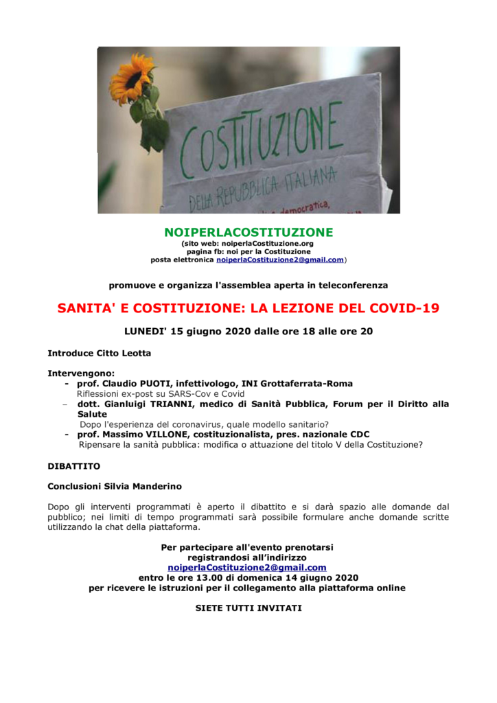 Si può assistere e intervenire prenotando la partecipazione entro le ore 13 di domenica 14 giugno 2020 scrivendo a noiperlaCostituzione2@gmail. com