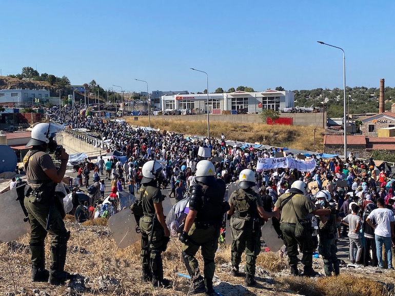 Sabato 12 settembre i rifugiati, esasperati, hanno organizzato una manifestazione per protestare contro le forze antisommossa che impedivano loro di raggiungere il porto di Mitilene. La manifestazione è degenerata e la polizia ha lanciato gas lacrimogeni. “Una bambina di dieci giorni ha inalato gas, dormiva per strada da quattro giorni, ha vomitato tutta la notte. È possibile che bambini, anziani ed ammalati vengano abbandonati così?”, si chiede un operatore di Medici senza Frontiere (MSF). Domenica mattina, la polizia greca ha cercato di impedire che giornalisti e fotografi seguissero un’altra protesta.