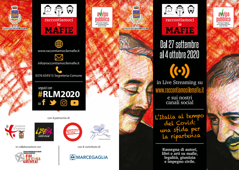 Torna dal 27 settembre al 4 ottobre 2020 la nuova edizione di “Raccontiamoci le mafie”, la rassegna di autori, libri e arti su mafie, legalità, giustizia e impegno civile ideata dal Comune di Gazoldo degli Ippoliti (Mn) e realizzata in collaborazione con Avviso Pubblico.