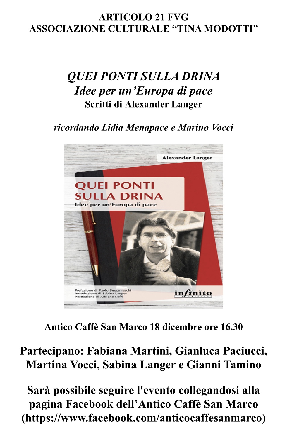 All’incontro, in programma venerdì 18 dicembre alle 16.30, che sarà possibile seguire collegandosi alla pagina Facebook dell’Antico Caffè San Marco (https://www.facebook.com/anticocaffesanmarco), parteciperanno Fabiana Martini (Articolo 21 FVG), Gianluca Paciucci (Associazione culturale Tina Modotti), Sabina Langer e Gianni Tamino (Fondazione Alexander Langer Stiftung), Martina Vocci. Nel corso dell’evento sarà ricordata anche Lidia Menapace, anche lei molto vicina ai temi cari a Marino ed Alex, con cui per un periodo a Bolzano aveva condiviso l’impegno su questi fronti.
