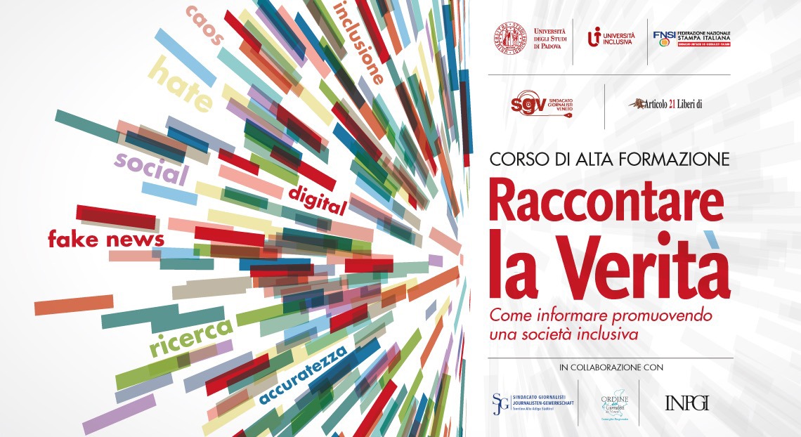 C’è tempo fino al 10 marzo 2021 per iscriversi al corso di alta formazione sul tema ‘Raccontare la verità – Come informare promuovendo una società inclusiva e combattere le fake news’, organizzato web dall’Università degli studi di Padova in collaborazione con Federazione nazionale della Stampa italiana, Sindacato giornalisti Veneto e associazione Articolo 21. (Qui il link all’avviso di selezione pubblicato sul sito web dell’ateneo).