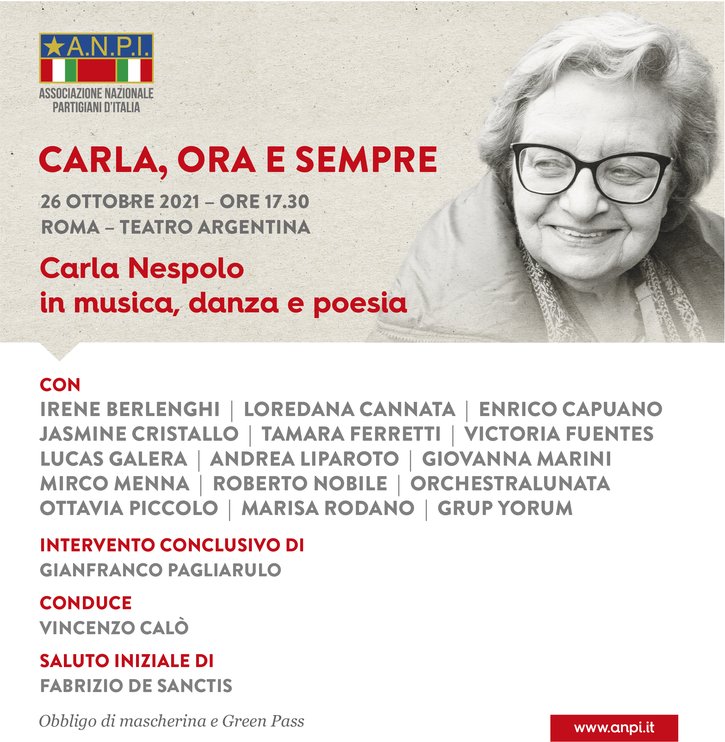 Il 26 ottobre al Teatro Argentina di Roma, evento in ricordo della Presidente nazionale ANPI Carla Nespolo nel primo anniversario della sua scomparsa. Il programma...