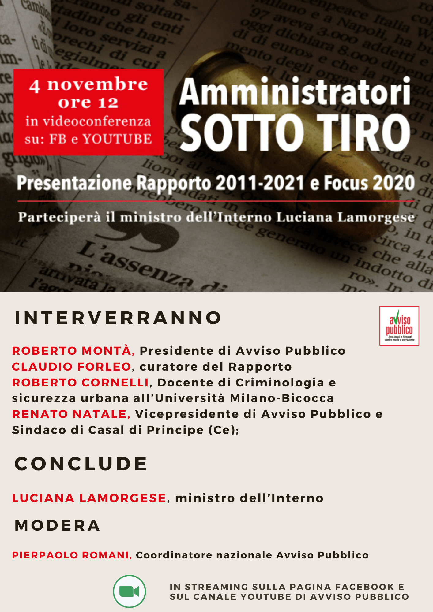 Il 4 novembre, a partire dalle ore 12,00, in streaming sui canali Facebook e Youtube di Avviso Pubblico, presenteremo la 10a edizione del Rapporto “Amministratori sotto tiro”, riferito agli atti intimidatori e di minaccia censiti dall’Associazione nel corso del 2020 nei confronti degli amministratori locali e del personale della Pubblica Amministrazione in Italia. Durante la videoconferenza, nel corso della quale sarà presentato uno specifico approfondimento sui dati raccolti negli ultimi dieci anni, interverrà il Ministro dell’Interno, Luciana Lamorgese.