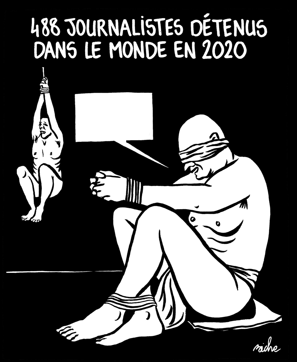 Un’azione partecipativa lanciata da Charlie Hebdo sul proprio profilo Twitter per chiedere agli utenti di dare voce, attraverso i commenti, alla vignetta che raffigura due uomini imprigionati e torturati. Una scritta campeggia sopra le figure e riporta i dati del report pubblicato pochi giorni fa da Reporter senza frontiere. Il risultato finale sarà la prossima copertina del magazine satirico francese.