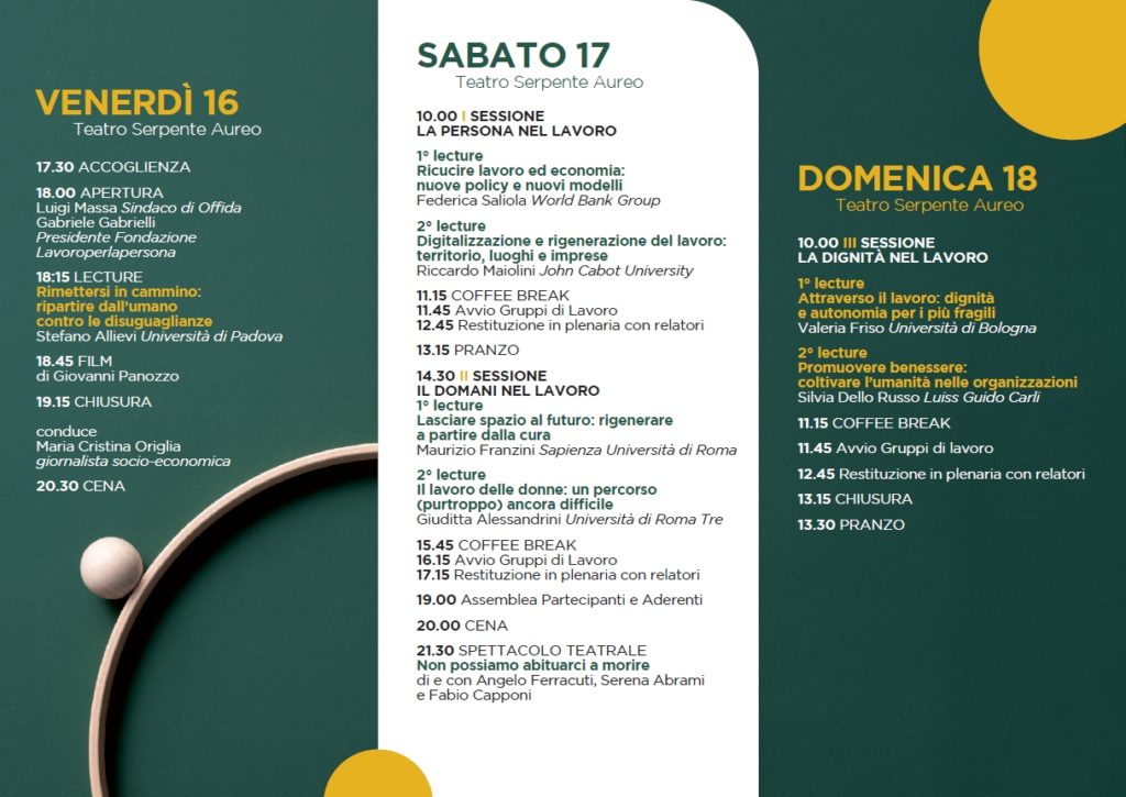 “Il seminario della Fondazione Lavoroperlapersona è un momento importante di riflessioni sul lavoro”, dichiara il sindaco di Offida Luigi Massi. “Ce n’è bisogno, sempre, oggi più che mai: in un momento come questo di incertezze, difficoltà e veloci cambiamenti. Il lavoro oltre a offrire quella solidità economica necessaria dovrebbe diventare un luogo che rimette al centro la persona, la sua dignità e la sua soddisfazione”, aggiunge il primo cittadino, annunciando l’imminente apertura dei lavori che si svolgeranno nel bellissimo teatro Serpente Aureo. Il teatro ospiterà sabato 17 alle 21:30 anche lo spettacolo “Non possiamo abituarci a morire” di e con Angelo Ferracuti, Serena Abrami e Fabio Capponi sulla vita e sull’opera del poeta Luigi Di Ruscio. I momenti conviviali previsti nella tre giorni si svolgeranno invece presso l’ex Convento di San Francesco, sempre in pieno centro storico. L’evento sarà condotto dalla giornalista socio-economica Maria Cristina Origlia.