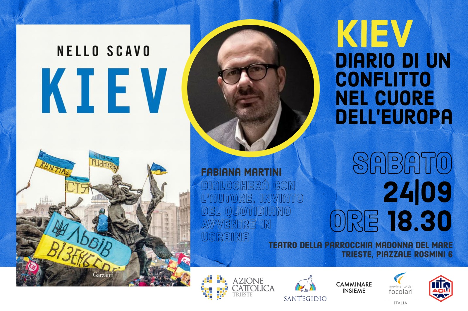 L’evento è organizzato dall’Azione Cattolica triestina in collaborazione con la Comunità di Sant’Egidio, il gruppo Camminare Insieme, il Movimento dei Focolari e le Acli provinciali; l’appuntamento è alle ore 18.30 di sabato 24 settembre nel teatro della parrocchia Madonna del Mare di piazzale Rosmini.