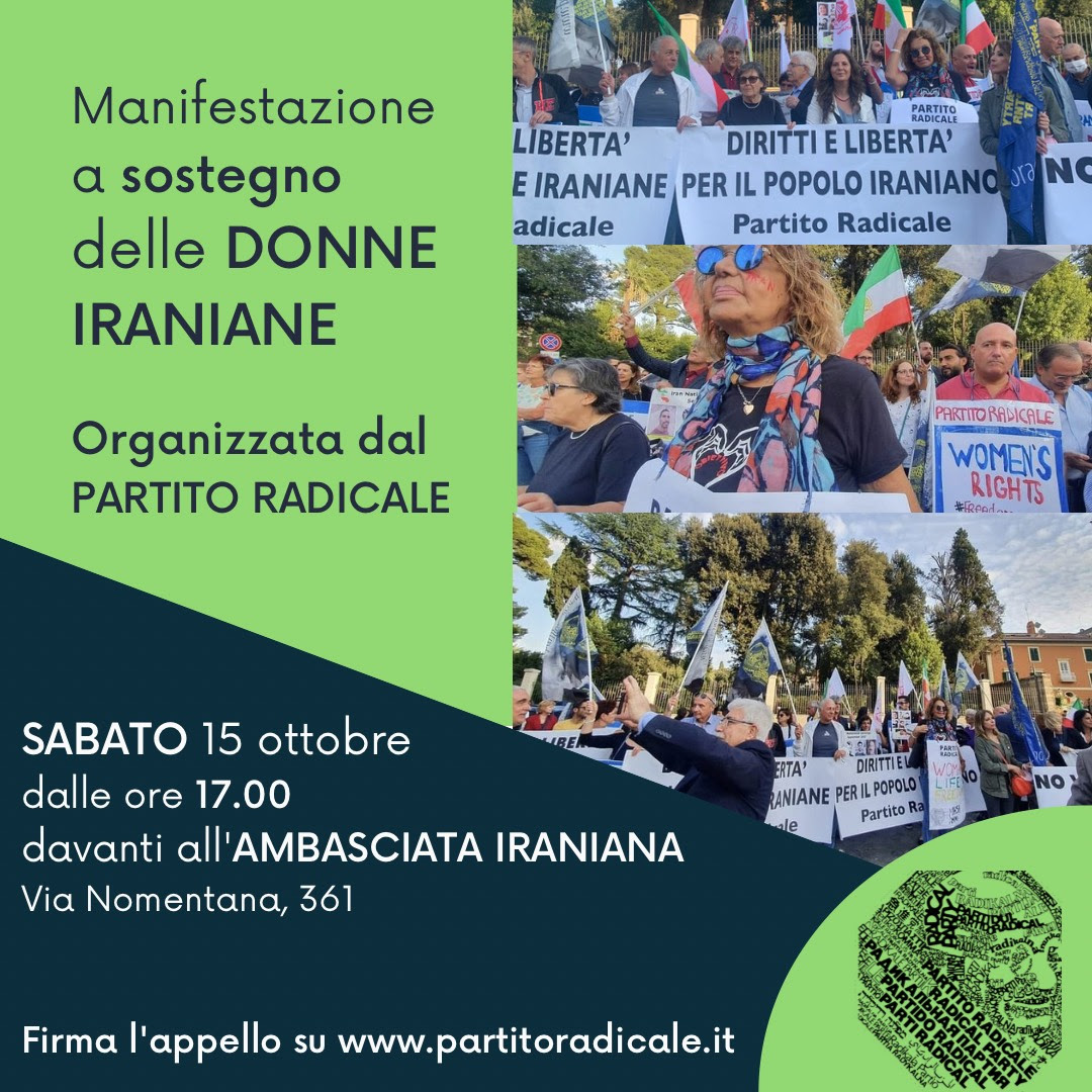 Sabato 15 ottobre dalle ore 17 il Partito Radicale manifesterà per la terza volta davanti la sede dell’Ambasciata della Repubblica Islamica dell’Iran in via Nomentana 361 a sostegno delle donne iraniane che denunciano il regime degli ayatollah e rivendicano i loro diritti.