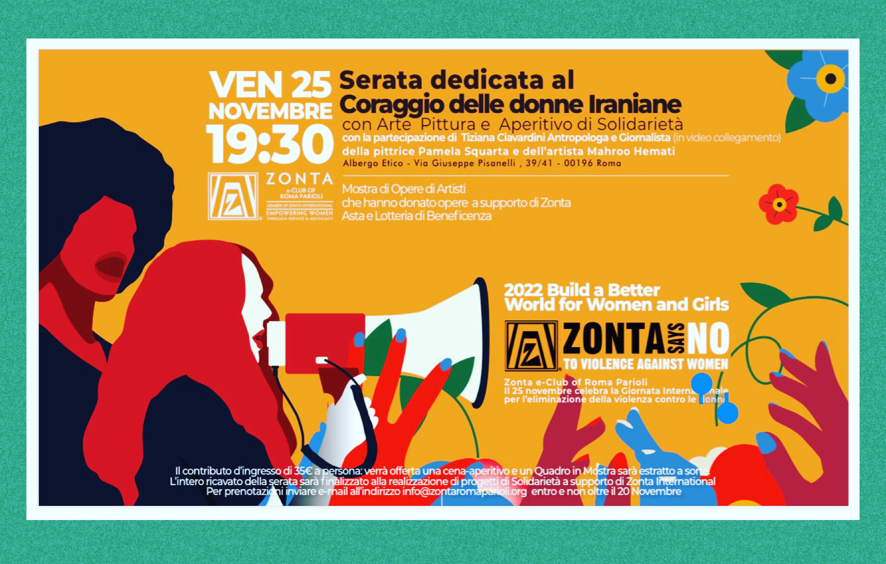 Quest’anno l’e-Club Zonta Roma Parioli ha sentito l’esigenza in questa ricorrenza di celebrare il Coraggio delle Donne Iraniane, per ricordare a tutti che in questi giorni in Iran c’e una grossa battaglia con centinaia di vittime, in gran parte donne che scendono in piazza per reclamare i loro Diritti.