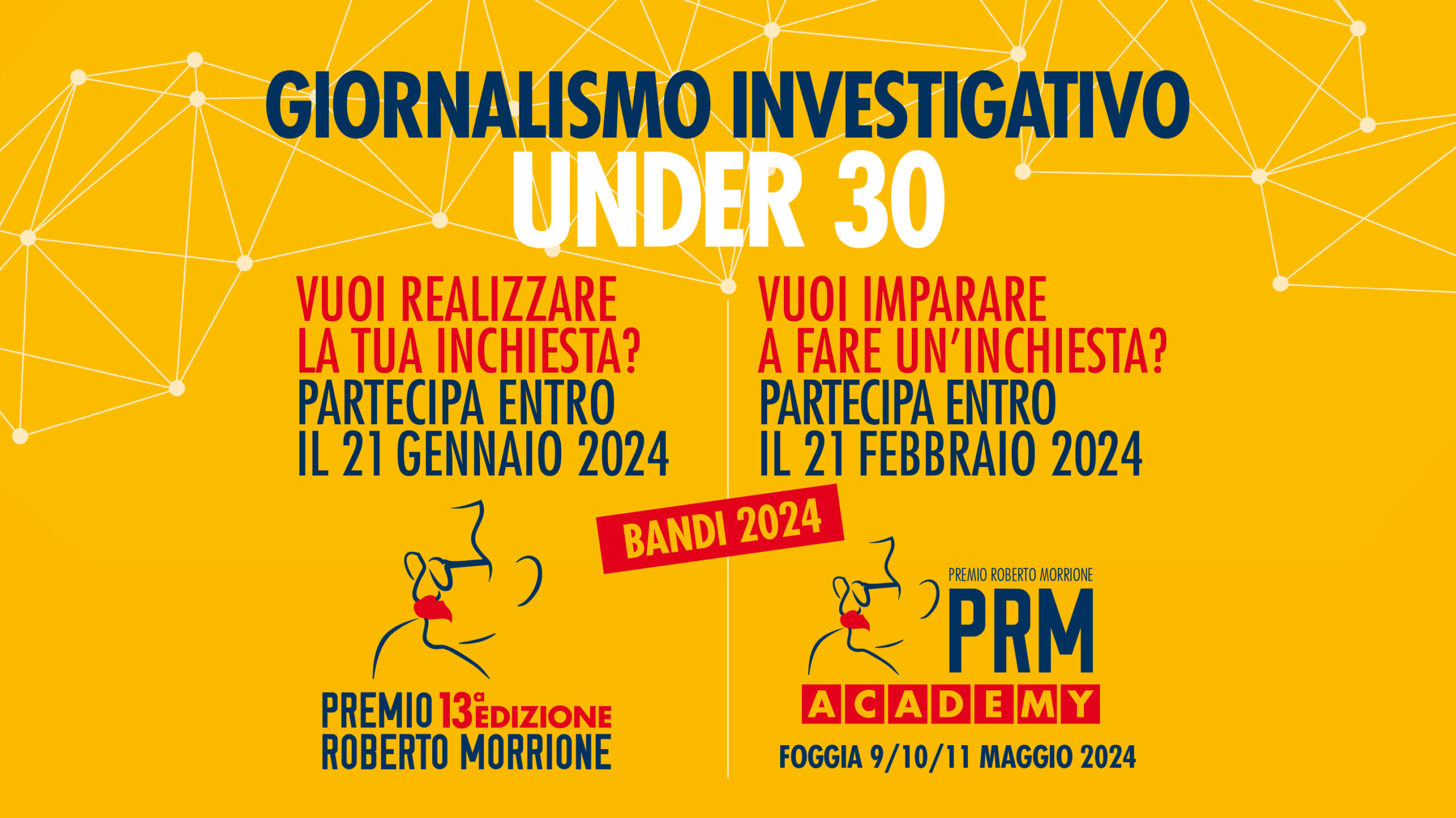 Il bando del Premio Roberto Morrione chiude il 21 gennaio 2024, mentre, un mese dopo, il 21 febbraio 2024 chiude quello della PRM Academy. Si puo inviare la candidatura per entrambi i bandi.