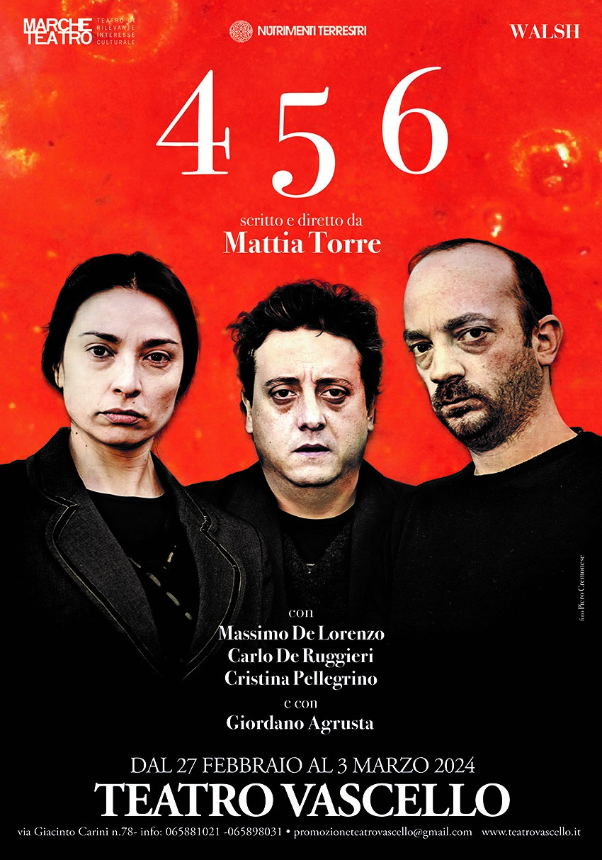Di Mattia Torre continueremo a sentire la mancanza, del suo linguaggio ironico e pungente. E’ questa la sensazione che si prova dopo aver visto ‘4 5 6’ da lui scritto e diretto, riportato in scena dagli stessi 3 attori con cui lo spettacolo aveva debuttato nel 2011, in scena al Teatro Vascello fino al prossimo 3 marzo.