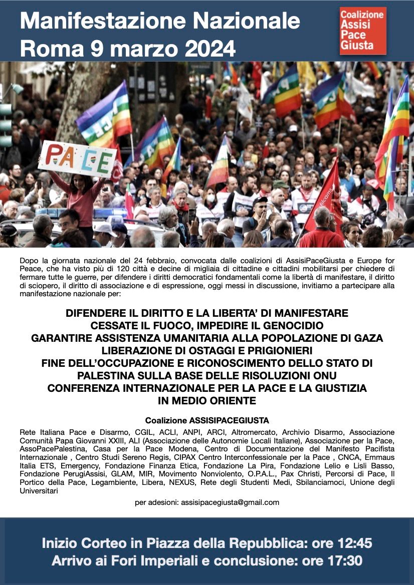 Il 9 marzo manifestazione nazionale a Roma: difendere il diritto e la libertà di manifestare; cessate il fuoco a Gaza; impedire il genocidio; garantire assistenza umanitaria alla popolazione; liberare ostaggi e prigionieri; fine dell’occupazione; riconoscimento dello Stato di Palestina sulla base delle risoluzioni ONU; conferenza internazionale per la pace e la giustizia in Medio Oriente. Tra i promotori l’ANPI insieme alla Cgil, alle associazioni democratiche, cattoliche e studentesche.