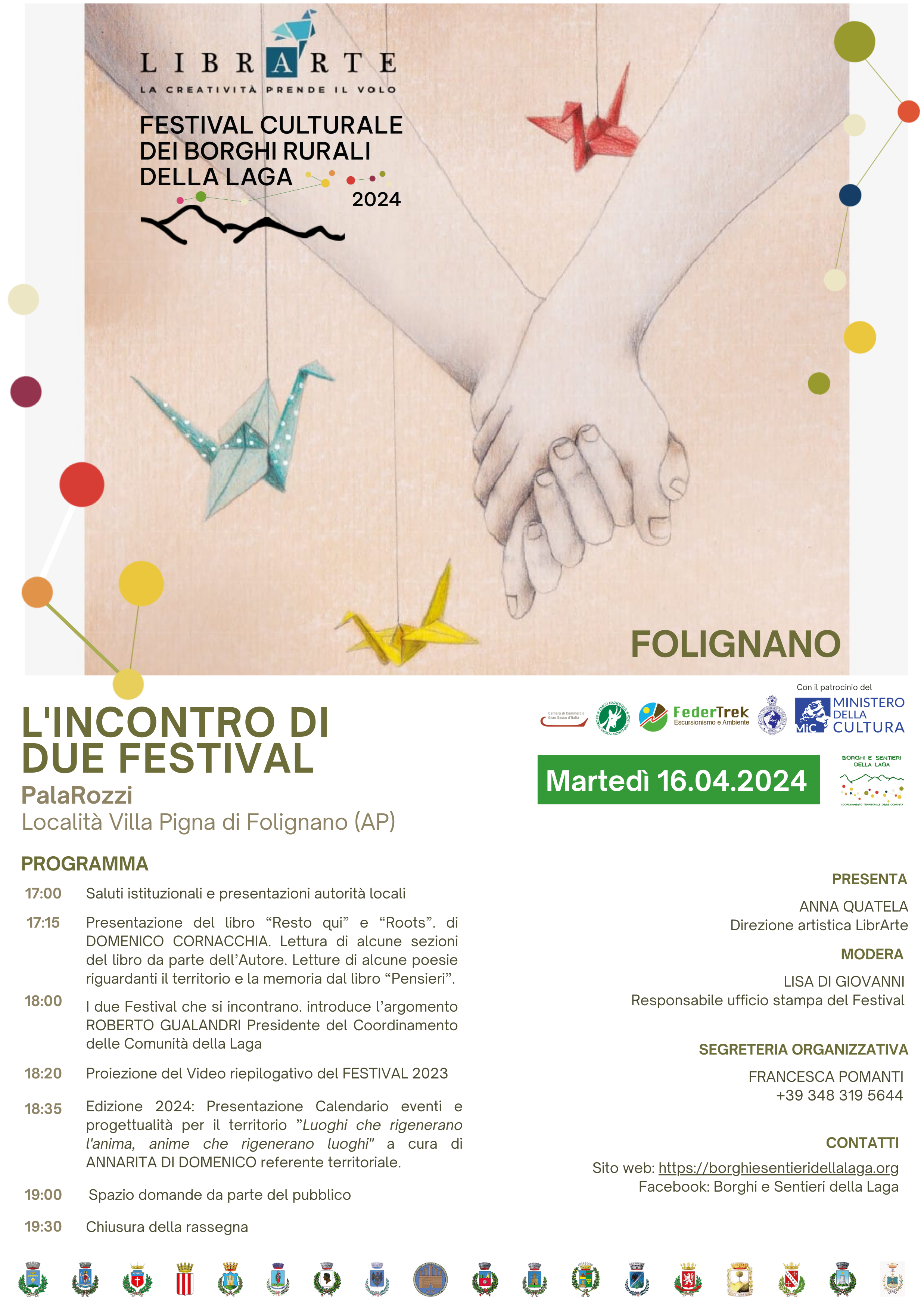 A seguito della cerimonia d’apertura, seguirà la Presentazione del Festival nell’area picena nella giornata di martedì 16 Aprile presso il PalaRozzi di Folignano (AP), all’interno della rassegna “LibrArte 2024”, in una sorta di intreccio evento fuori dal comune. La terza presentazione del progetto, avverrà invece a Roma il 23 Aprile presso il Palazzetto Mattei in Villa Celimontana sede della Società Geografica Italiana. In quest’occasione sarà dato più spazio al valore geografico e scientifico del progetto.