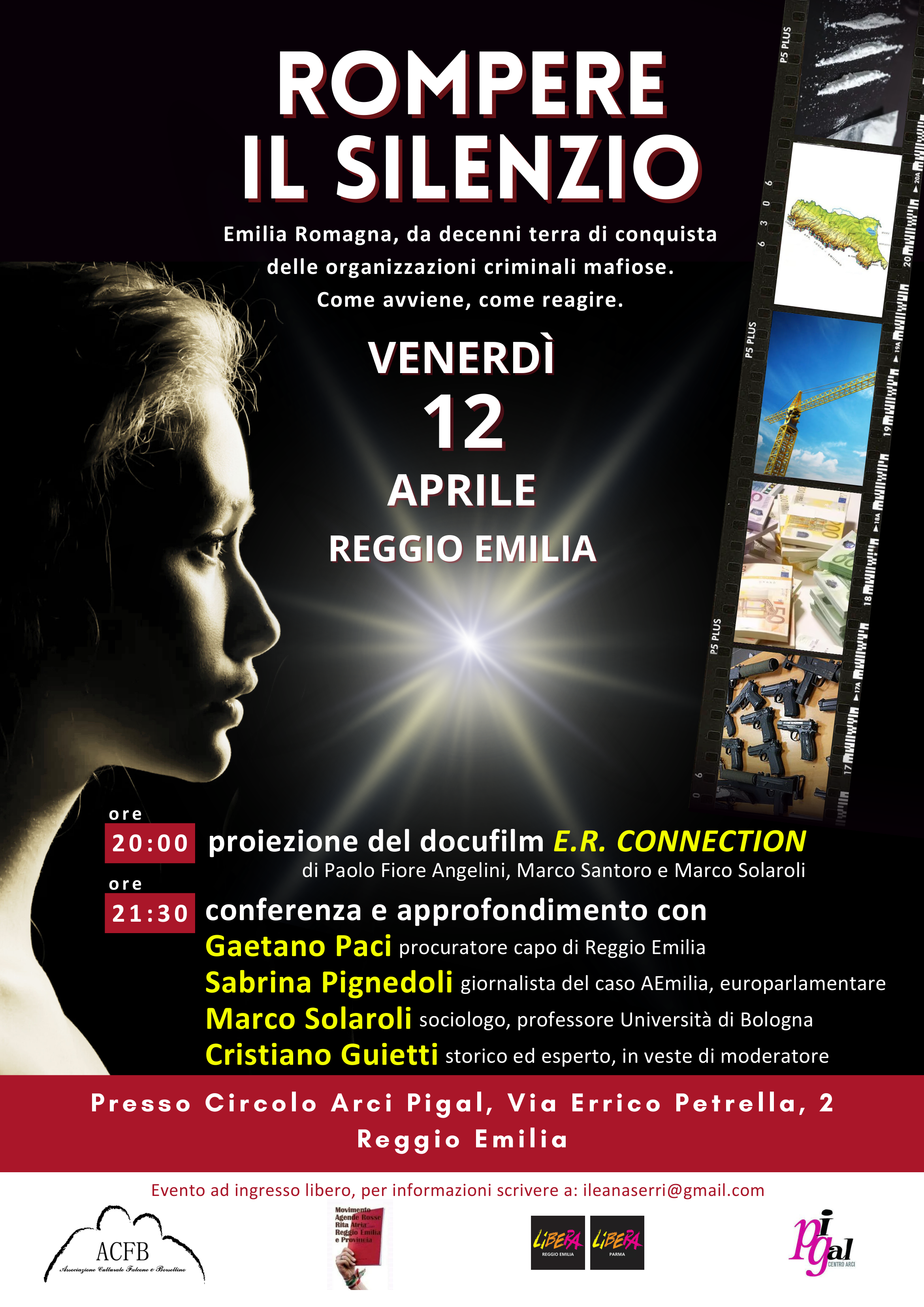 L’evento inizierà alle ore 20 con la proiezione del concreto ed efficace docufilm ER Connection. Diretto da Paolo Fiore Angelini, si concentra sulle infiltrazioni criminali nel Reggiano e lungo la riviera adriatica. Attraverso dieci video-interviste a sindaci, avvocati, giornalisti, attivisti e imprenditori coinvolti nel caso Aemilia, si conosceranno la complessità del fenomeno, il suo radicamento sul territorio e la voce di quei cittadini che vi si contrappongono.