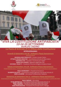 Il giorno 15, domenica, ore 11, incontro sul tema “La costituzione è antifascista” con Paolo Berizzi unico giornalista in Europa costretto a vivere sotto scorta per le minacce dei fascisti, Mari Franceschini, presidente ANPI regionale, Carlo Bartoli, Presidente Ordine Nazionale Giornalisti ed Elisa Marincola, portavoce Articolo 21.
