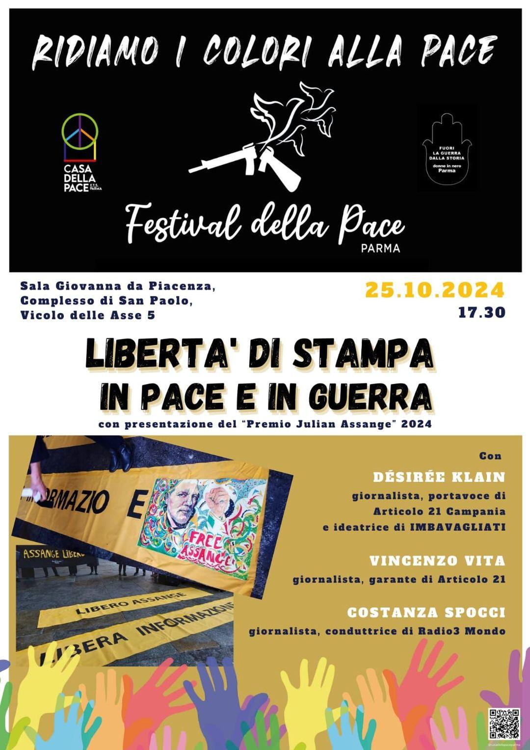 Un’ incontro dal titolo “Libertà di stampa in pace e in guerra”, è quello proposto da Casa della Pace e curato da Donne In Nero Parma nel corso della terza edizione del Festival della Pace: domani (venerdì25 ottobre) a Parma alle ore 17.30 nella Sala Giovanna del Complesso di San Paolo, Vicolo delle Asse n.5.