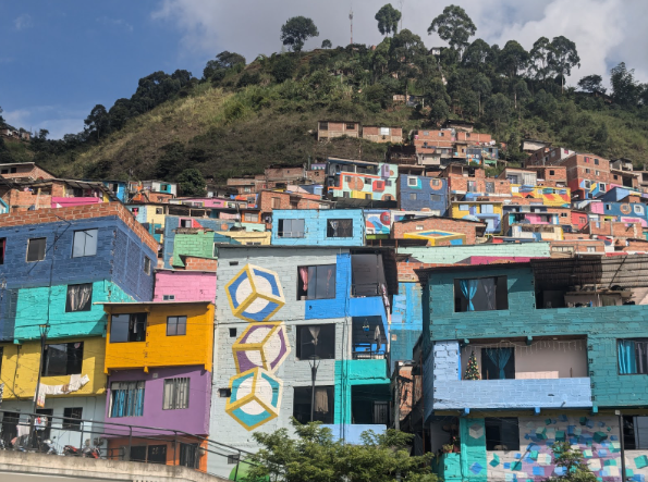“Noi provvediamo alla riqualificazione sociale e ambientale, mentre la Alcaldia di Medellin si occupa delle abitazioni, attraverso agenzie municipali come ISVIMED che offre ai residenti in difficoltà economiche materiali gratuiti per rifare pavimenti, bagni e cucine. “ David, attivista coordinatore per la fondazione, ci spiega come sono ripartiti i compiti tra servizio pubblico e privato: “La APP (Alianzas Público Privadas) ha rifatto tutte le facciate dei barrios di Brisas del Jardín e San José de la Cima, patrocinando un progetto artistico del pittore plastico Fredy Alzate. Oltre a migliorare le condizioni degli abitanti, il municipio mira al turismo internazionale, attraverso visite guidate per emancipare le periferie dalla cattiva fama passata, facendo anche cassa per finanziare questo sforzo collettivo”. Le palazzine dipinte a colori vivaci ricoprono le colline dei barrios, affacciandosi su strade asfaltate, attraverso una scalinata che collega le varie sezioni di Uva de La Armonía, La Alegría y Los Sueños, davanti a fontane e parco giochi, per un totale di oltre 100mila residenti.
