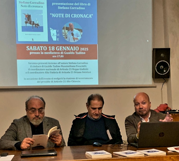 L’appello per chiedere la libertà per Alberto Trentini, il cooperante veneziano imprigionato in Venezuela da novembre, ha aperto la serata a Gualdo Tadino di presentazione del libro “Note di Cronaca” di Stefano Corradino, giornalista di Rainews24, direttore di Articolo21 e giornalista che nel testo, edito da Villaggio Maori racconta il suo progetto di trasformare in canzoni (che lui stesso ha scritto e cantato) alcune storie vere da lui raccontate su Rainews24.