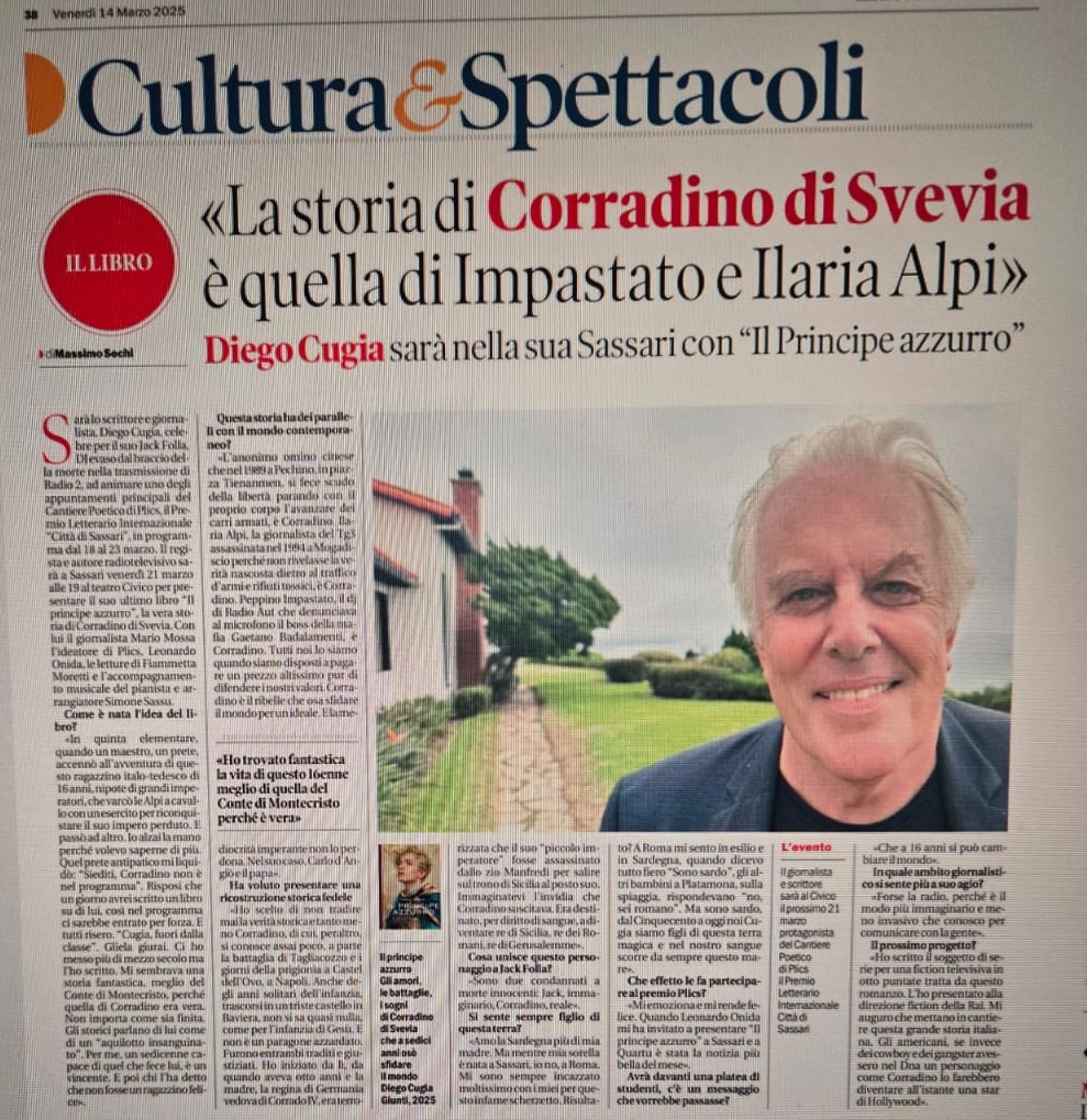 Sarà lo scrittore e giornalista, Diego Cugia, celebre per il suo Jack Folla, DJ evaso dal braccio della morte nella trasmissione di Radio 2, ad animare uno degli appuntamenti principali del Cantiere Poetico di Plics, il Premio Letterario Internazionale “Città di Sassari”, in programma dal 18 al 23 marzo. Il regista e autore radiotelevisivo sarà a Sassari venerdì 21 marzo alle 19 al teatro Civico per presentare il suo ultimo libro “Il principe azzurro”, la vera storia di Corradino di Svevia. Con lui il giornalista Mario Mossa l’ideatore di Plics, Leonardo Onida, le letture di Fiammetta Moretti e l’accompagnamento musicale del pianista e arrangiatore Simone Sassu.